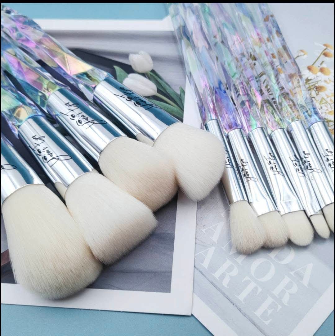 Elevate your beauty routine with the Splendor 10-Piece Makeup Brush Set by Yana’s Eyes — a luxury synthetic brush collection designed for flawless blending and elegant display. Featuring ultra-soft white bristles and stunning crystal-style handles, this set delivers professional performance while doubling as a statement piece for your vanity.